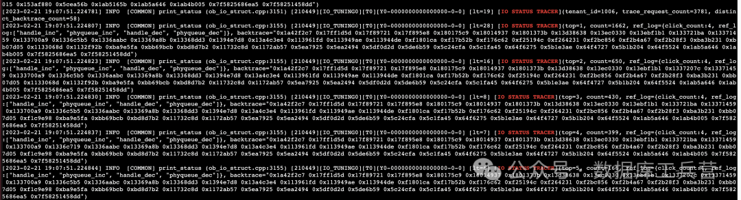 追踪内存泄漏。obclient> ALTER SYSTEM SET leak_mod_to_check = 'io_trace';通过命令在日志中过滤关键词,查看 tracer 抓到的堆栈信息。