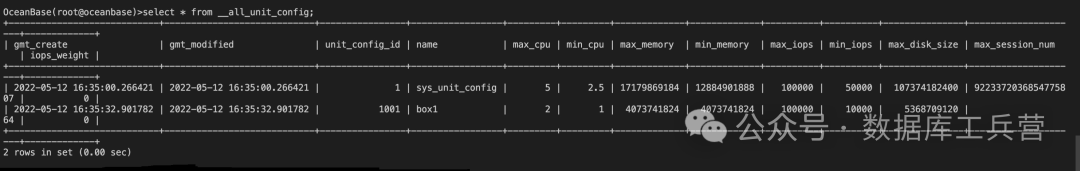 SELECT * FROM oceanbase.DBA_OB_UNITS\G;查看集群内所有租户的资源分配情况。