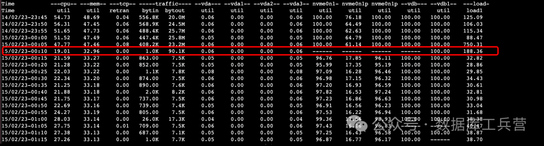 也有可能是磁盘压力过大(util 90% 以上,如图 2)或者性能抖动,使用系统性能监控工具 tsar 展示的对应盘 util 使用率和 load 负载情况。