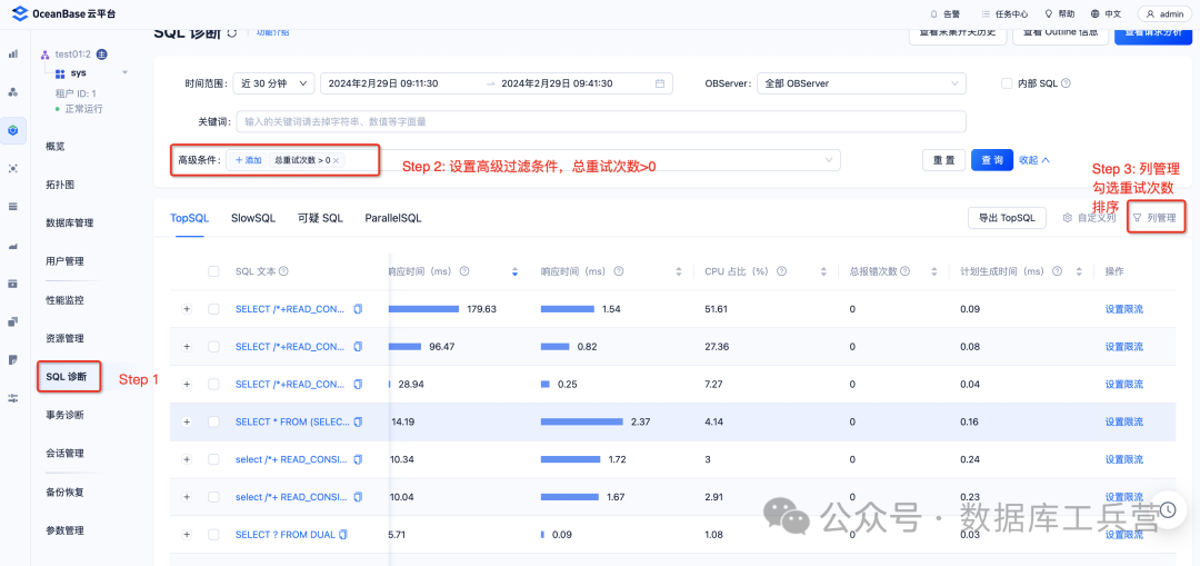 同时如果你的环境是通过ocp部署的,还可以通过里面的SQL诊断的TOP SQL页面过滤重试次数大于0的SQL,也可以初步筛查可能的SQL.