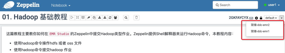 然后你就可以在 Notebook 里通过下拉框的方式来切换集群,比如你一开始选择一个开发集群来做开发,等作业开发完之后想切换到生产集群,你只需下拉框选择对应的集群就可以,如下图所示: