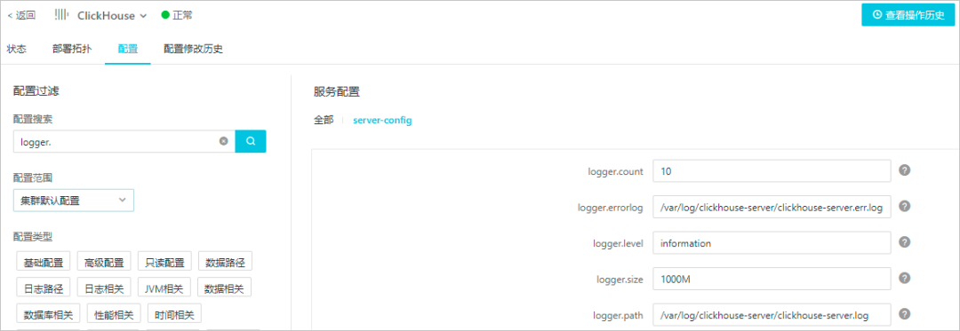您可以在 ClickHouse 服务配置页面的服务配置区域,在 server-config 页签中查看或修改配置,或者在 ClickHouse 服务的配置页面,在搜索区域搜索 logger.,即可查看或修改所有的日志配置项。