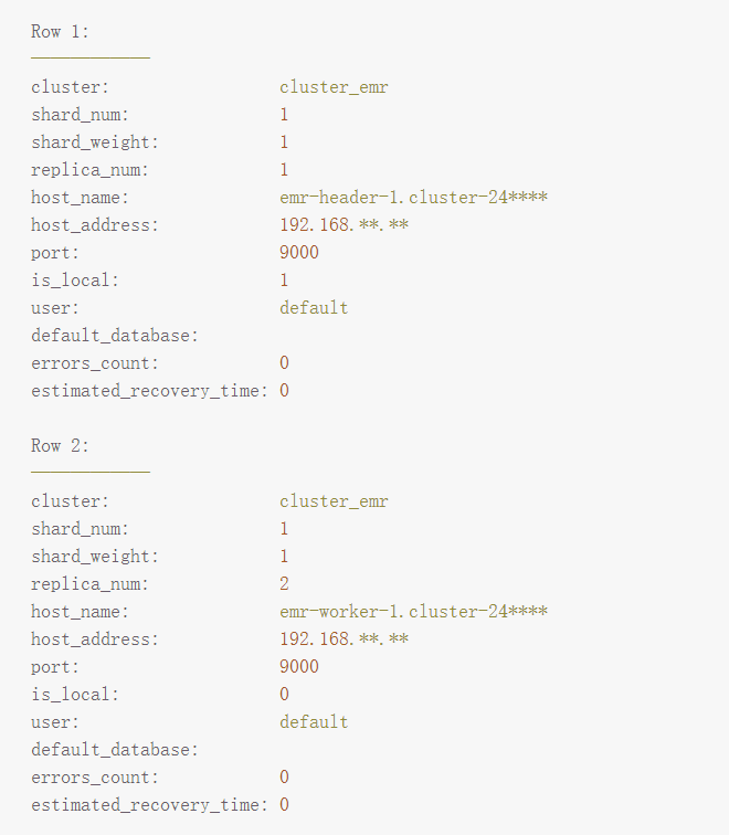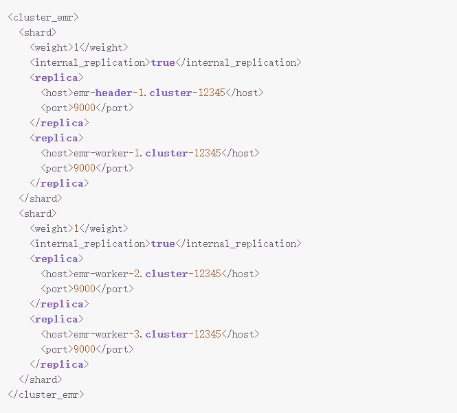 例如,创建集群时设置2个 Shard 和2个 Replica,则 clickhouse_remote_servers 值如下所示: