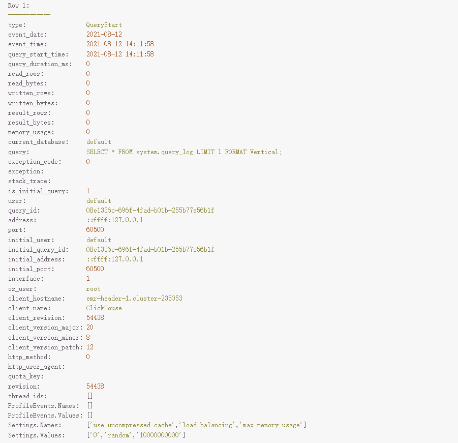 | query_thread_log.table | 如果在使用的profile中设置log_query_threads=1,则会记录下参与了查询操作的线程信息,这些信息会被记录在表中。