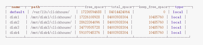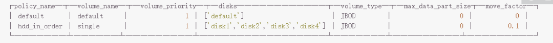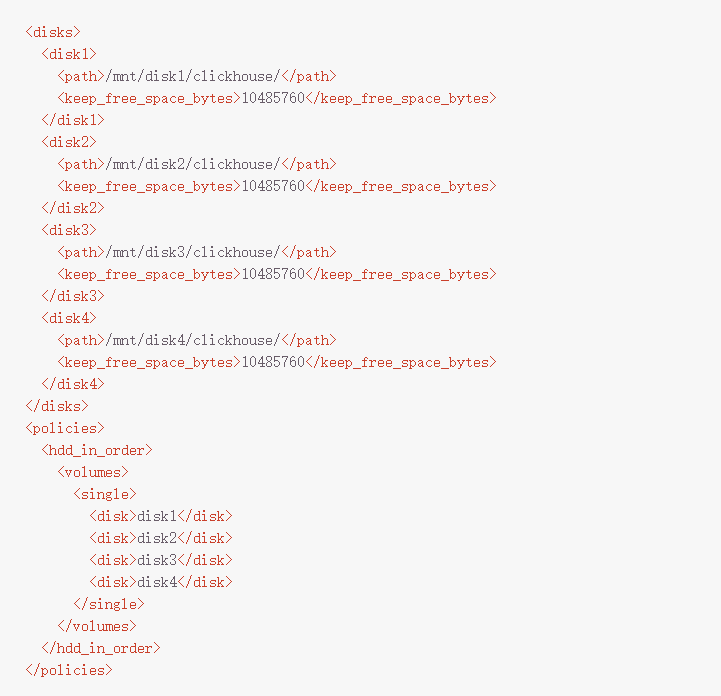 | storage_configuration | 用来指定自定义的磁盘信息。阿里云 E-MapReduce 默认会自动为每块磁盘创建 ClickHouse 的数据目录,并且为这些磁盘创建一个 HDD in order 的磁盘策略。 |