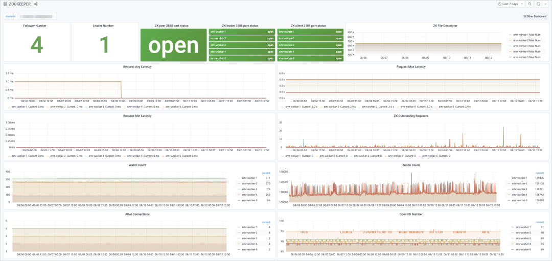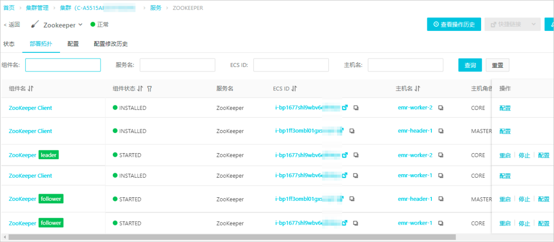 | zookeeper_servers | 用来配置ClickHouse集群所使用的ZooKeeper信息。默认值为创建ClickHouse集群时同时创建的ZooKeeper的值。多个ZooKeeper节点时,请使用英文逗号(,)进行分隔,例如,emr-header-1.cluster-12345:2181,emr-worker-1.cluster-12345:2181,emr-worker-2.cluster-12345:2181。 |