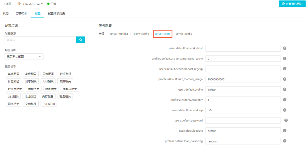 您可以在 ClickHouse 服务配置页面的服务配置区域,查看或修改配置。users 配置在 server-users 页签中。