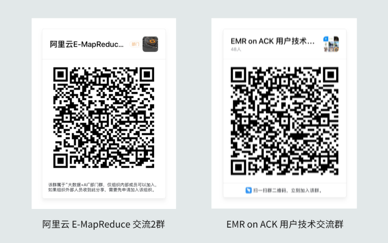 扫描下方二维码加入阿里云 EMR 相关产品钉钉交流群一起参与讨论吧!