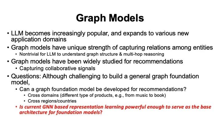 大语言模型优势是经过训练,可以应用到各个不同的方面,不只是总结,还可以用于问答、翻译等等。但图模型基本上每一种应用都需要训练一个不同的模型。在图模型方面,能否做一个通用的基础模型?实际上有困难,因为不同的应用,图的构造是非常不同的。但如果只聚焦在一个应用方面,比如推荐场景,是可以实现跨市场和跨领域的商品推荐这样的泛化能力。所以要思考的第一个问题:当前基于图神经网络( GNN)的图模型解决方案是否足够强大,能够作为图基础模型的基座呢?