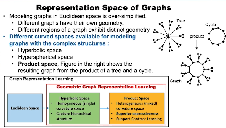 不同的图具有不同的结构,有的接近树状结构,有的接近循环。实际上,即使是在同一个图上,不同部分的结构也可能不同。因此,仅用单一的空间来表示可能不够理想,可以使用乘积空间来表示,以增加灵活性。例如把一个双曲空间(Hyperbolic space)做乘积。虽然双曲空间可以有效捕获层级结构,但它存在单一曲率的限制,如果用乘积空间来表示,就可以得到混合的曲率空间,这样不仅可以得到更好的表达,还能进行对比学习。这样,就可以在每个组成部分空间中计算距离,并将它们结合起来。总体来说,乘积空间(product space)为比较和学习图的不同部分提供了更好的框架。