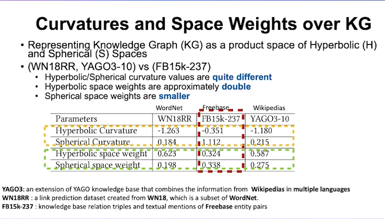 以知识图谱为例,尽管知识图谱看似相似,但实际上它们之间存在差异。例如,Freebase、WordNet和Wikipedia这三个不同的知识图谱,如果我们把这些图解构为双取空间和球面空间的乘积的话,Freebase与WordNet和Wikipedia是不同的。因为Freebase的双曲曲率小很多,但其球面曲率值较大,它的权重也不同。这表明,在构建基础图模型时,将WordNet转移到Wikipedia的可能性较高,而转移到Freebase的成功率较低,因为与Freebase的图构造不同。