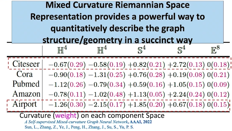 因此,使用混合曲率空间来表示这些图,提供了一种量化表示图结构的方法,这为构建图的基础模型提供了一个新的方向。