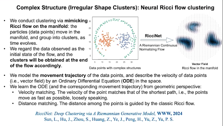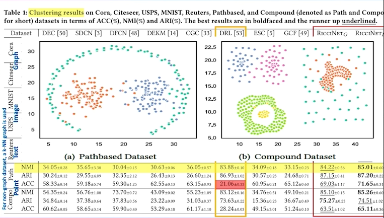 通过在混合曲率空间中定义图,可以解决传统的聚类方法难以处理的复杂问题。这种方法可以推广到图像数据(image data)、文本数据(text data)和点数据(point data),是一种很通用的解决方案。我们的结果显示,RicciNet比传统方法有显著优势。之所以能够取得这么好的效果,是因为我们的策略并不是单纯寻找边界,而是在构建一个黎曼流。之所以能够取得这么好的效果,是因为我们的策略并不是单纯寻找边界,而是在构建一个黎曼流。