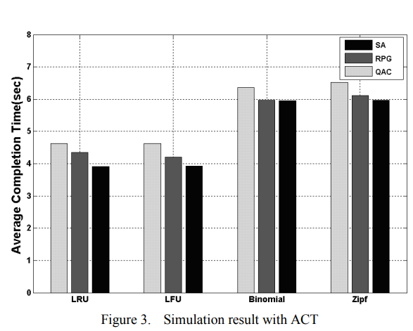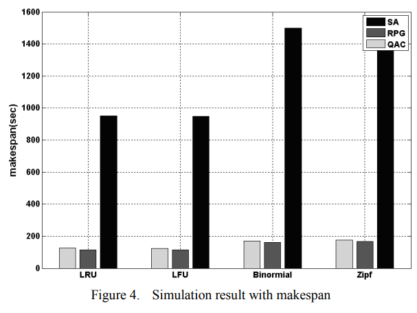 图3和图4显示了由具有上述四种不同文件替换策略的RNSE组成的网格中任务集的ACT和makespan的模拟结果。可以发现,RPG算法的ACT比QAC算法低,但略高于SA算法。另一方面,在图4中,SA的完成时间比其他的大得多。