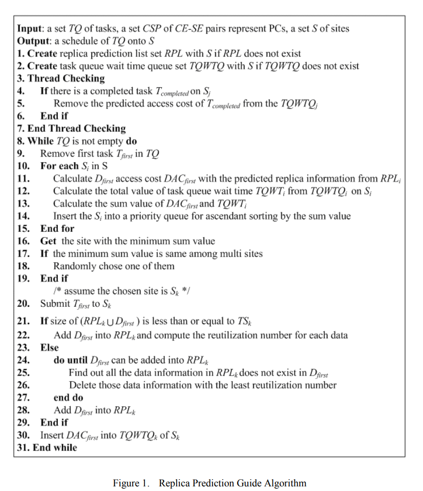 对于第2节中提出的网格模型,有两种信息与副本间接相关:任务之间的数据共享和工作目录的磁盘空间。这些信息用于帮助网格调度程序跟踪每个站点上发生的数据复制。RPG主要分为两个阶段:副本预测列表(RPL)管理和任务调度。网格调度程序为每个站点维护一个RPL、一个任务队列等待时间队列(TQWTQ)和工作目录的总大小(TS)。算法如图1所示。RPL中的每个元素都有一个数据名称、数据大小和数据的再利用计数器。TQWTQ中的每个元素都保存某个任务的预测访问时间。TQWTQ是一个FIFO队列。步骤9-20是任务调度。对于一组任务中的每个选定任务T的第一个,计算每个站点的访问成本和任务队列等待时间,并计算总和