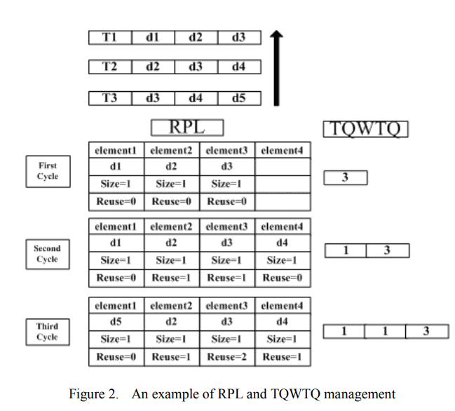 对于第二个周期,因为T2和RPL之间的两个数据(d2,d3)相同,所以TQWTQ的第二个元素是1。在这个周期中,总数据大小仍然小于4,因此没有文件替换,但d2和d3的重用计数器增加了一。对于T3,输入数据d5的信息不能直接存储到RPL中,因此进行文件替换。存在重复使用次数最少的两个数据(d1和d4),但T3需要d4,因此d1被d5代替。TQWTQ现在有三个要素。如果检测到T1完成,则具有值3的元素将从TQWTQ中移除。可以发现,即使先前的任务没有完成,也可以立即调度任务,因为在给定站点的RPL中预测了数据存储和文件替换的操作模式。