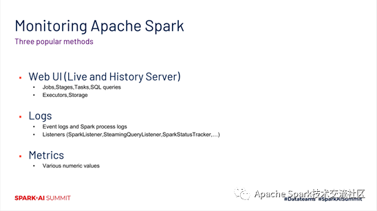 在使用Apache Spark去做ETL,去做数据分析和处理的过程中,我们肯定都会涉及到监控spark程序这么一项工作。一般来说,有三种方式去做程序的监控。第一个就是使用Web UI。第二块主要是日志。第三种是Metrics。这三个信息,最大的一个问题是说,我们一般是在ETL夯住了或者失败之后,才会去查看。如果有这么一个系统能够帮助我们,在任务性能下降或者失败之前