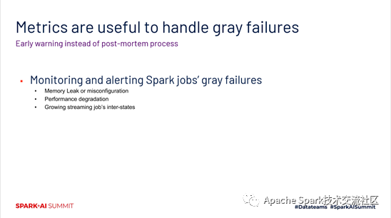 在分布式系统中,比较大的挑战之一就是如何做到在故障发生之前就能够有些规避的措施,或者一些提醒的措施。Metrics在一个分布式系统里边是非常关键和核心的一个模块。在spark里边,同样也是有很多的metrics。使用metrics我们能够发现内存泄露,一些配置错误,在性能下降之前的一些监控,以及对于流作业的一些监控等等。