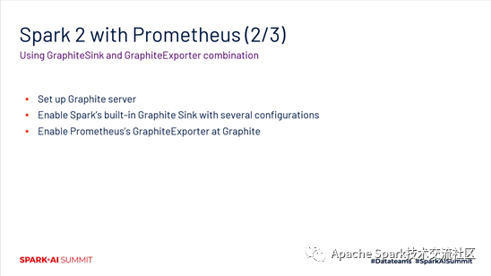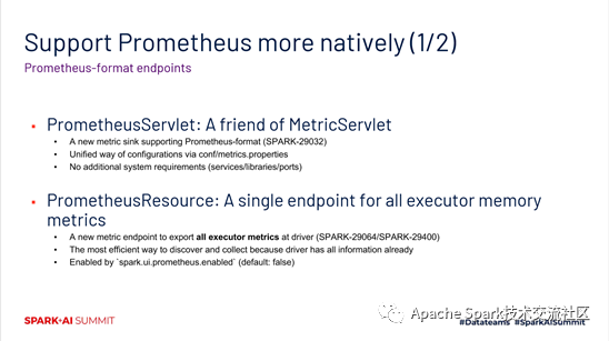为了更好的做一些本地化支持的工作,主要加了两个组建。一个是PrometheusServlet,它会生成Prometheus兼容的一个格式,它的配置方式跟以前的metrics system配置是一样的。同时也不会引入其他的一些库,也不会对特定端口进行依赖。第二个组件是PrometheusResource。针对executor memory metrics相关的信息,提供了这么一个独立的endpoint。