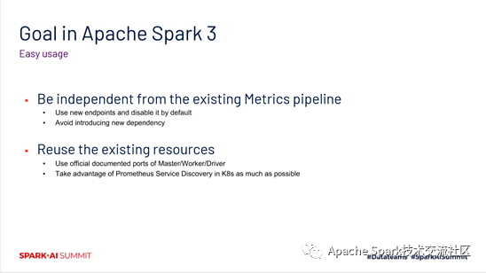 所以在spark 3.0中,就提出了新的目标。主要有两个需要关注的设计点。一个就是只使用到新的endpoint,不去跟原先的pipeline耦合,不引入对其他一些组件的依赖。另外一块就是尽量重新使用已经存在的一些资源,包括端口的资源,等等。