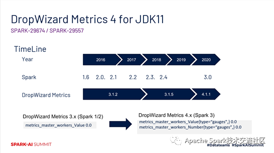 接下来,我会介绍一下在spark 3.0中如何实现刚才提到的目标,更好的本地化支持Prometheus。Spark的metrics模块依赖比较重的是DropWizard这么一个组件。它在spark 3.0中也做了一次升级,带来的好处是能够支持jdk11,但是也存在小的负面点,就是它的数据格式有所变化,如下图所示。