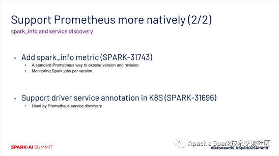 在3.0中增加了spark_info metric,它的作用是针对不同版本的监控和报警。另外,对driver service annotation做了一些增强,能够实现利用Prometheus service discovery的特性,从而更方便的进行一些metrics的采集和监控。