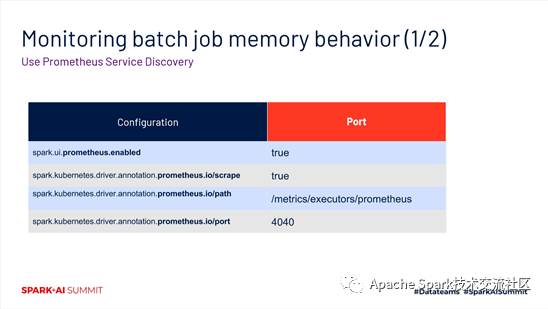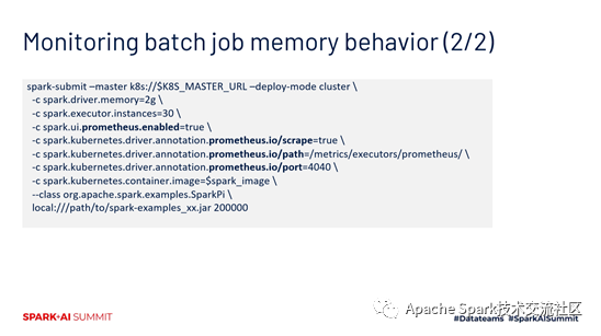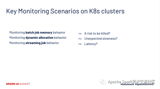 在K8s环境下面,怎么去基于已经集成Prometheus的spark版本,对我们的作业进行监控,主要有三个场景。第一个是对一些批作业的内存的情况进行监控。第二个是对动态调度和动态资源分配的监控。第三个是对流作业的监控。