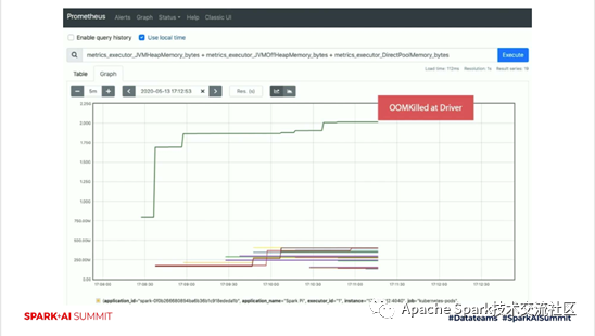如下图所示,是一个针对内存的监控。它是executor_id为1的时候,对它的内存使用的监控。可以看到绿色的这条线,我们从driver端拿到这个状态之后,就可以提前知道已经有OOM的风险,通过Prometheus从driver端采集到监控信息,就可以及时的做一些报警和预处理。