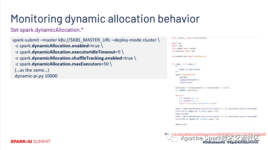 第二个场景就是动态调度。Spark 3.0支持在K8s上动态调度。主要就是把一些配置打开,如下图中的黑体部分所示。配置打开之后,在作业提交的时候,就能够开启在K8s环境的动态调度。
