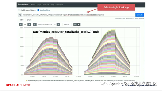 然后我们看一下在Prometheus上展示的一个状态信息图,每一条线表示有一个executor。我们看到随着时间推移,线的个数在不断的变多,然后又变少。隔了一分钟之后,又进入到第二轮,也是同样的先变多,再变少。