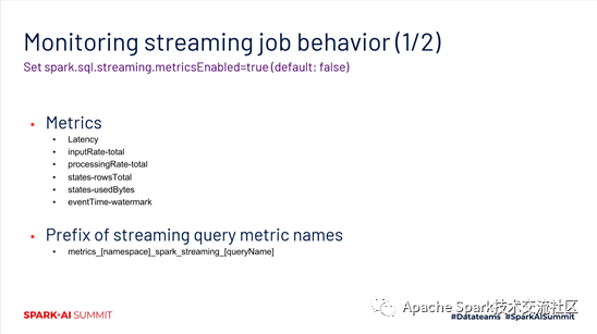 最后一种场景,是针对流作业的监控的支持。在spark 3.0中,添加了spark.sql.streaming.metricsEnabled。开启之后,它会提供6种metrics,如下图所示。对一个流作业,如果要使用Prometheus监控,最好在一开始就对nameSpace等提前做好设置,避免后续出现数据的不一致。