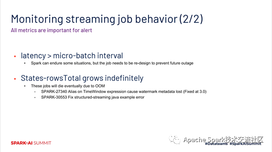 前面提到的6种metrics对于流作业都是比较关键的,都应该去监控并且做一些报警处理。这里重点再提两个。一个就是前面提到的延时,如果latency > micro-batch interval,就可能存在一些性能问题,需要关注。另外一个报警就是States-rowsTotal。如果它无限的增长,可能会导致流作业发生OOM。这个也是需要做好监控和报警的。