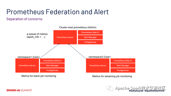 在针对Prometheus的使用方式这块,社区在3.0建议的是基于federation的模式。如下图所示,左边是在namespace1下面对批作业的一个监控。右边是在namespace2下面对流作业的一个监控。他们都可以同时发送到一个Cluster-wise Prometheus下面,然后通过spark_info等等这些信息做一些数据的细分。