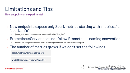 以上就是spark 3.0对于Prometheus监控的一些支持。目前来说还是处在一个实验性的阶段,所以还存在一些问题。第一个问题就是新的endpoint暴露的metrics是只包含metrics_或者spark_info开头的这么一些信息。第二个问题是,PrometheusServlet目前的命名格式没有遵循Prometheus的命名风格。第三个问题是,在流作业这块,如果没有把namespace做一些很好的配置,可能会导致metrics不断的的增加,甚至互相影响。