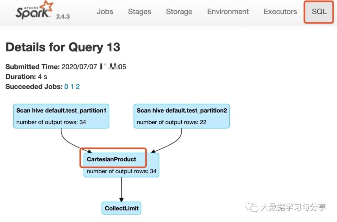 -- Spark SQL内部优化过程中选择了SortMergeJoin方式进行处理select * from test_partition1 t1 cross join test_partition2 t2 on t1.id = t2.id;