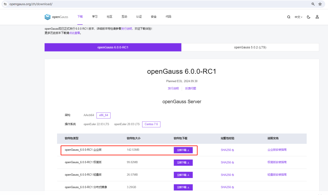 a.通过https://opengauss.org/zh/download/登录openGauss开源社区,选择对应平台的企业版安装包。