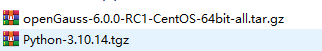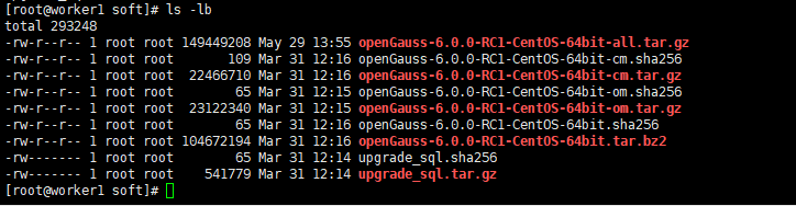 [root@worker1 soft]# ls -lbtotal 293248-rw-r--r-- 1 root root 149449208 May 29 13:55 openGauss-6.0.0-RC1-CentOS-64bit-all.tar.gz-rw-r--r-- 1 root root 109 Mar 31 12:16 openGauss-6.0.0-RC1-CentOS-64bit-cm.sha256-rw-r--r-- 1 root root 22466710 Mar 31 12:16 openGauss-6.0.0-RC1-CentOS-64bit-cm.tar.gz-rw-r--r-- 1 root root 65 Mar 31 12:15 openGauss-6.0.0-RC1-CentOS-64bit-om.sha256-rw-r--r-- 1 root root 23122340 Mar 31 12:15 openGauss-6.0.0-RC1-CentOS-64bit-om.tar.gz-rw-r--r-- 1 root root 65 Mar 31 12:16 openGauss-6.0.0-RC1-CentOS-64bit.sha256-rw-r--r-- 1 root root 104672194 Mar 31 12:16 openGauss-6.0.0-RC1-CentOS-64bit.tar.bz2-rw------- 1 root root 65 Mar 31 12:14 upgrade_sql.sha256-rw------- 1 root root 541779 Mar 31 12:14 upgrade_sql.tar.gz[root@worker1 soft]#