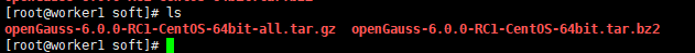 [root@worker1 soft]# lsopenGauss-6.0.0-RC1-CentOS-64bit-all.tar.gz openGauss-6.0.0-RC1-CentOS-64bit.tar.bz2[root@worker1 soft]#