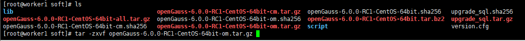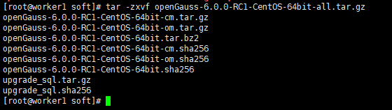 [root@worker1 soft]# tar -zxvf openGauss-6.0.0-RC1-CentOS-64bit-all.tar.gzopenGauss-6.0.0-RC1-CentOS-64bit-cm.tar.gzopenGauss-6.0.0-RC1-CentOS-64bit-om.tar.gzopenGauss-6.0.0-RC1-CentOS-64bit.tar.bz2openGauss-6.0.0-RC1-CentOS-64bit-cm.sha256openGauss-6.0.0-RC1-CentOS-64bit-om.sha256openGauss-6.0.0-RC1-CentOS-64bit.sha256upgrade_sql.tar.gzupgrade_sql.sha256[root@worker1 soft]#