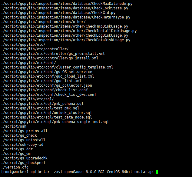[root@worker1 soft]# lslib openGauss-6.0.0-RC1-CentOS-64bit-cm.tar.gz openGauss-6.0.0-RC1-CentOS-64bit.sha256 upgrade_sql.sha256openGauss-6.0.0-RC1-CentOS-64bit-all.tar.gz openGauss-6.0.0-RC1-CentOS-64bit-om.sha256 openGauss-6.0.0-RC1-CentOS-64bit.tar.bz2 upgrade_sql.tar.gzopenGauss-6.0.0-RC1-CentOS-64bit-cm.sha256 openGauss-6.0.0-RC1-CentOS-64bit-om.tar.gz script version.cfg[root@worker1 soft]# tar -zxvf openGauss-6.0.0-RC1-CentOS-64bit-om.tar.gz