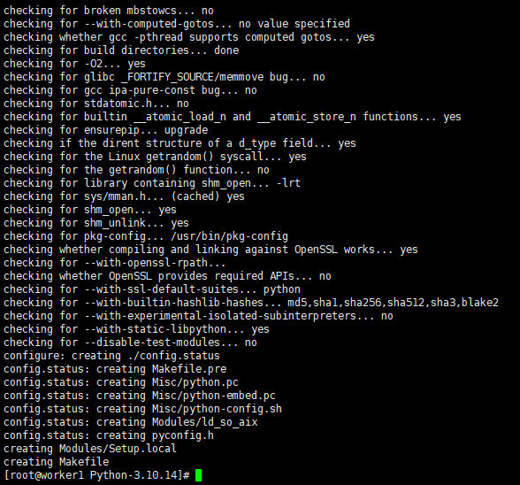 [root@worker1 soft]# cd Python-3.10.14/[root@worker1 Python-3.10.14]# ./configure --prefix=/usr/local/python3 --enable-shared --enable-optimizations