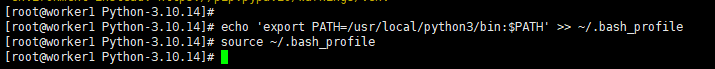 [root@worker1 Python-3.10.14]#[root@worker1 Python-3.10.14]# echo 'export PATH=/usr/local/python3/bin:$PATH' >> ~/.bash_profile[root@worker1 Python-3.10.14]# source ~/.bash_profile[root@worker1 Python-3.10.14]#