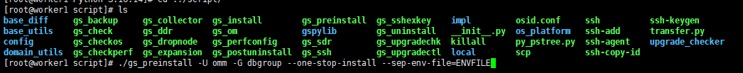 [root@worker1 script]# lsbase_diff gs_backup gs_collector gs_install gs_preinstall gs_sshexkey impl osid.conf ssh ssh-keygenbase_utils gs_check gs_ddr gs_om gspylib gs_uninstall __init__.py os_platform ssh-add transfer.pyconfig gs_checkos gs_dropnode gs_perfconfig gs_sdr gs_upgradechk killall py_pstree.py ssh-agent upgrade_checkerdomain_utils gs_checkperf gs_expansion gs_postuninstall gs_ssh gs_upgradectl local scp ssh-copy-id[root@worker1 script]# ./gs_preinstall -U omm -G dbgroup --one-stop-install --sep-env-file=ENVFILE