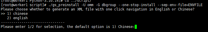 [root@worker1 script]# ./gs_preinstall -U omm -G dbgroup --one-stop-install --sep-env-file=ENVFILEPlease choose whether to generate an XML file with one click navigation in English or Chinese?>> 1) chinese2) english-------------------------------Please enter 1/2 for selection, the default option is 1) Chinese: