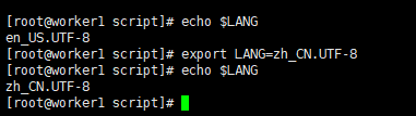[root@worker1 script]# echo $LANGen_US.UTF-8[root@worker1 script]# export LANG=zh_CN.UTF-8[root@worker1 script]# echo $LANGzh_CN.UTF-8[root@worker1 script]#
