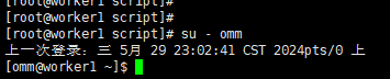 [root@worker1 script]# su - omm上一次登录:三 5月 29 23:02:41 CST 2024pts/0 上[omm@worker1 ~]$