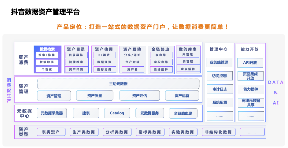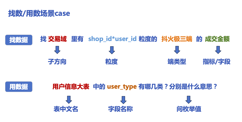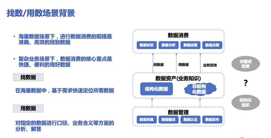 数据资产平台是对数据地图的一次迭代升级,可以将其视作一个更高级版本的资产管理平台。数据资产平台的定位是打造一个一站式的数据资产门户,旨在简化数据消费的流程,以此促进数据的高效生产。这个平台涵盖了多个方面的功能,包括数据资产的消费与管理、元数据中心的建设,以及资产管理中心的能力开放。这一切都致力于为用户提供更加便捷和高效的数据管理和应用体验。在互联网公司中,数据被视为生命线,贯穿于整个业务流程。短视频平台等产品依赖于海量的数据,而在这些数据中,最重要的部分便是数据资产。无论是数据资产平台的核心关注点,还是公司整体的发展战略,数据消费始终是重中之重——数据消费不仅包括数据研发、分析、运营,还涉及到管理层的决策制定。随着数据量的激增,第一个问题就是如何找到适用的数据,这是实现数据消费的前提。首先,需要快速定位到所需的优质数据。接着,需要确保这些数据能够与实际需求匹配。例如,对于一个直播活动的运营者来说,如何找到最近30天内表现最好的主播,便是一个典型的需求。● 第一个问题是如何在海量数据中快速定位目标数据。这个过程类似于定义一个有效的搜索机制,使用户能够基于需求精准找到所需的数据。● 第二个问题是如何应用这些数据,特别是如何对选定的数据进行详细的业务分析和定义解释。例如,在数据消费的场景中,传统方法通常依赖于结构化的组织形式和关键词检索。这种方法在数据量较少、业务复杂性较低时较为有效,通常在早期的数据地图构建中有所应用。然而,随着数据规模的扩大和业务复杂性的增加,传统的关键词检索方式开始显得力不从心,难以应对日益复杂的需求。为了更好地理解找数和用数的问题,来看2个找数、用数场景case:用户在交易域中寻找特定粒度的交易数据时,传统的关键词匹配难以奏效。以“抖火极三端”为例,这一术语涉及抖音、火山、极速版三个应用的集合,且与交易域中的细分维度紧密相关。这种情况下,关键词搜索无法有效定位所需数据,因此,需要更智能的搜索与数据分类机制,以确保用户能够快速找到符合特定业务场景的数据。在应用数据时,用户可能会问及数据表中某字段的具体类型及含义,如“user type”字段的枚举值及其含义。这类查询超出了简单的关键词检索范围,要求系统能够识别并解释复杂的数据结构和业务逻辑。因此,平台需要具备智能数据解析能力,支持对表格字段和枚举值的深入分析与解读,以满足用户对数据理解的需求。