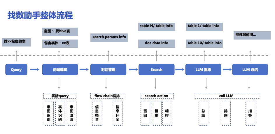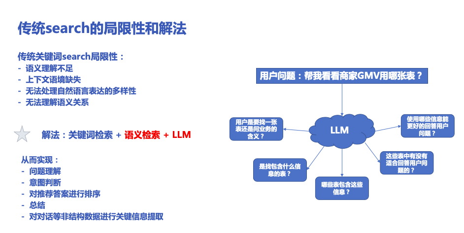 智能数据解析能力的目标,是将传统的关键词检索和向用户提供大量文档或schema的方式,转变为一种更智能、更高效的对话式推荐答案机制。这种机制类似于用户可以直接向数据的生产方或开发人员提问,当需要使用数据或对数据有疑问时,系统会以对话形式提供准确的答案,从而替代过去依赖关键词检索和人工阅读文档的方式。数据查找和使用的需求往往非常复杂,涵盖了不同的业务场景和多样化的应用需求。这种复杂性增加了系统对数据精确查找和匹配的难度。在数据开发过程中,原始数据的信息可能并不完整,甚至存在缺失的情况。这使得数据治理的难度加大,要求系统具备更高的治理能力以确保数据的准确性和完整性。业务领域内的专业术语和行业“黑话”较多,要求系统中的算法模型具备高度的泛化性和准确性,能够在复杂的语境中正确理解并提供数据。这对模型的性能和能力提出了较高的要求。传统搜索仅匹配关键词,无法深入理解用户的真实意图,导致对复杂查询的处理能力有限。在用户进行多轮追问或表达含有上下文关联的查询时,传统搜索无法准确把握语境,从而导致搜索结果与用户需求不符。用户可能以不同的方式表达相同的需求,但传统搜索引擎往往只能识别固定的关键词组合,无法应对自然语言中多样化的表达方式。关键词搜索无法理解词与词之间的语义关系,如同义词、反义词或词语间的关联性,导致搜索结果的准确性和相关性不足。为了克服上述局限性,提出了关键词检索与语义检索相结合,并引入大语言模型(LLM)的解决方案。这一方案通过以下几个步骤实现更为精确的搜索和推荐:利用大语言模型对用户查询进行语义分析,理解其背后的真实需求,即使用户以不同方式表达相同的意图,系统也能准确捕捉。通过语义检索,系统不仅能识别关键词,还能根据语义分析结果判断用户的意图,从而提供更贴合需求的搜索结果。结合关键词检索与语义检索,系统能根据相关性对检索结果进行排序,将最符合用户需求的答案推荐至前列。大语言模型具备对复杂查询进行总结的能力,能够简洁明了地提炼出关键信息,帮助用户更快找到所需内容。一个典型的例子是,当用户提出查询“帮我看看商家 GMV 用哪张表”时,系统首先通过语义分析识别用户意图,即查找适合的Hive表。在召回了多个相关表之后,系统能够进一步判断哪张表与用户需求最为相关,并指出该表中哪些字段可以回答用户的问题。这展示了大语言模型在理解复杂语义和提供精确答案方面的优势。/ 找数助手整体架构