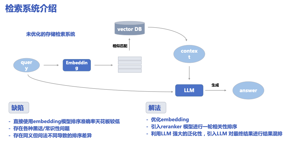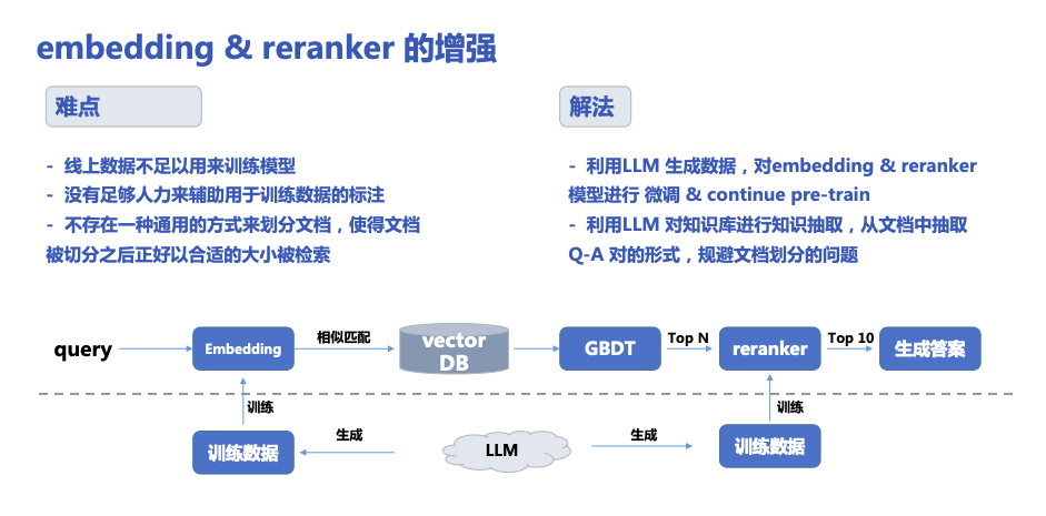 如何利用大模型(LLM)来增强现有的embedding和reranker模型。● 现有的线上数据量不足以支持有效的模型训练。之前用户的检索行为多为关键词搜索,提供的查询数据对当前模型的训练意义有限。简单的查询数据在复杂语义理解和泛化方面存在不足。● 对于训练数据的标注需求较高,需要具备足够的领域知识,这使得标注过程成本高昂。传统的标注方法无法有效支撑大规模数据需求。● 文档类型多样,无法通过一种通用方式划分文档内容,使得文档在切分后难以保持合适的大小以供检索。例如,白皮书中的一段500字文本可能包含多个观点,传统的工程式划分方式可能会截断这些观点,导致信息的丢失。通过LLM生成数据,并对embedding和reranker模型进行微调与持续预训练,以克服数据不足的挑战。利用LLM对知识库进行知识抽取,将文档内容转换为Q-A对的形式,从而规避文档划分问题,确保每个知识片段完整且易于检索。流程图展示了整个召回检索系统的结构,包括通过embedding生成向量,存储在Vector DB中,并通过排序生成最终答案。此阶段引入了大模型以辅助生成和优化结果。/ 为什么需要混排