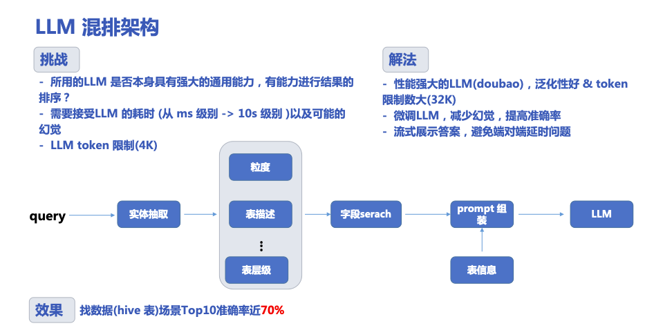 接下来介绍一下LLM混排架构的流程设计。在这个架构中,有几点需要特别注意:首先,这里有一段设计主要是为了服务于Prompt的组装,目的是确保Prompt的token数量不过多,因为过长的Prompt可能会导致模型处理效率下降。其次,大模型存在一个固有问题,即输入的Prompt中如果包含过多无关信息,模型的准确率可能会降低,同时“幻觉”现象(生成不相关或不准确内容)的发生率也会增加。因此,在实际操作中有一个重要的经验,就是要确保输入到大模型中的内容尽量是有用且有序的。这样,大模型的表现会更好,输出结果也会更加准确。经过这些改进,特别是引入大模型的混排机制后,系统在找表场景中的表现得到了显著提升。当前,Top 10的准确率接近70%,这已经是一个非常好的效果。